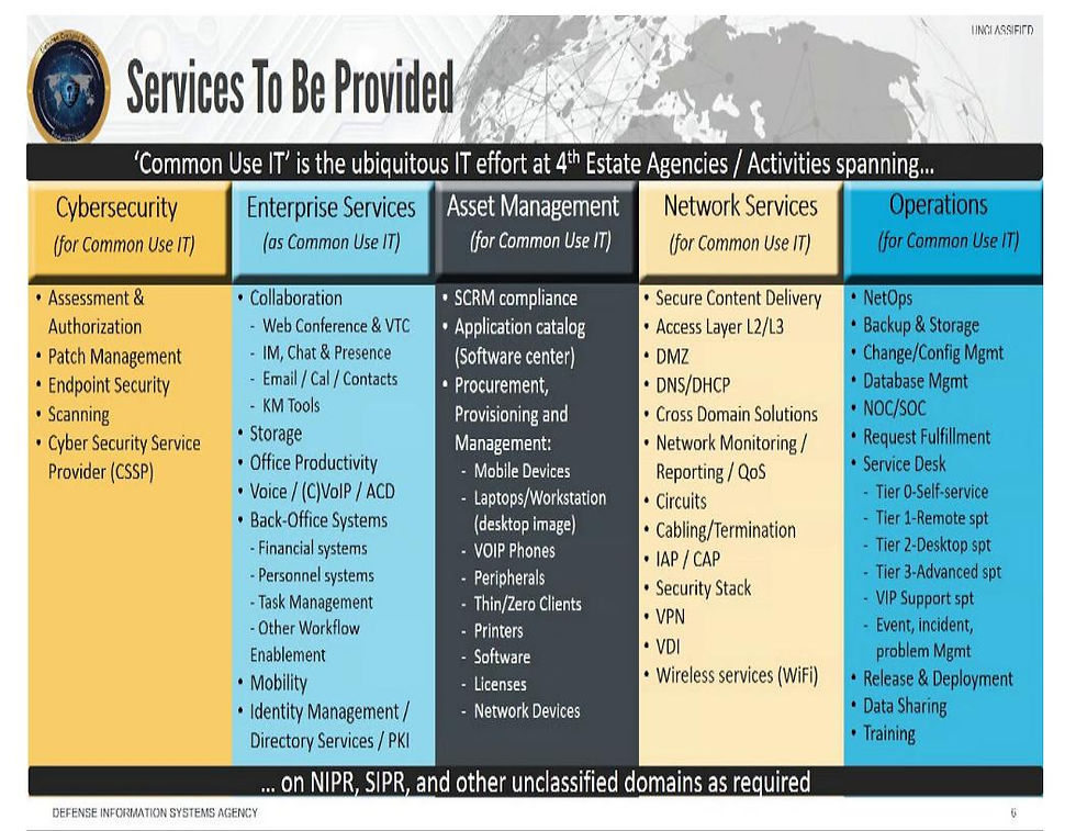 The contract [Solicitation], released Tuesday, stems from a 2019 policy that established DISA as the single IT service provider for fourth estate agencies. The company that wins the contract will unify the common-use IT systems and provide “integrated, standardized and cost-effective IT services, while improving security, network availability and reliability for 22 DAFAs within the Fourth Estate,” the RFP description states.